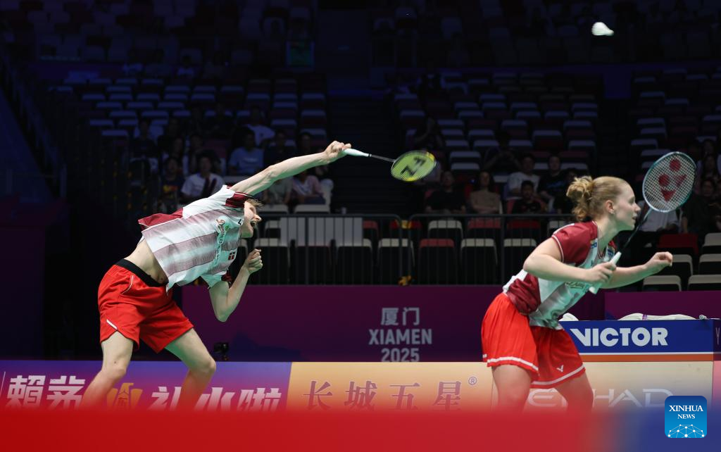 Lizzie Tolman (Front)/Estelle Van Leeuwen of England compete during the women's doubles match against Tanisha Crasto/Shruti Mishra of India of the Group D match between India and England at BWF Sudirman Cup in Xiamen, southeast China's Fujian Province, May 1, 2025. (Xinhua/Wang Kaiyan)