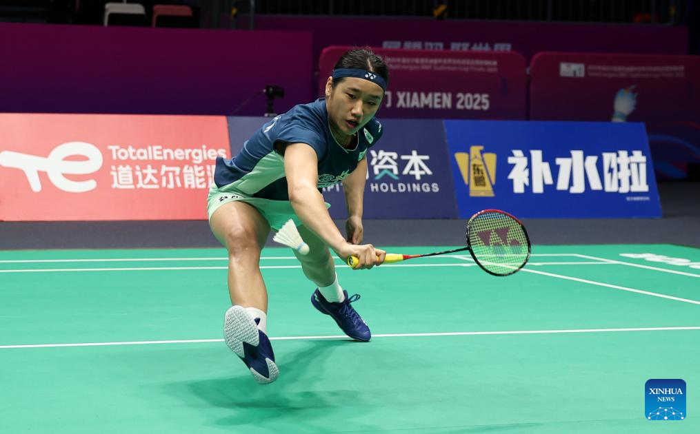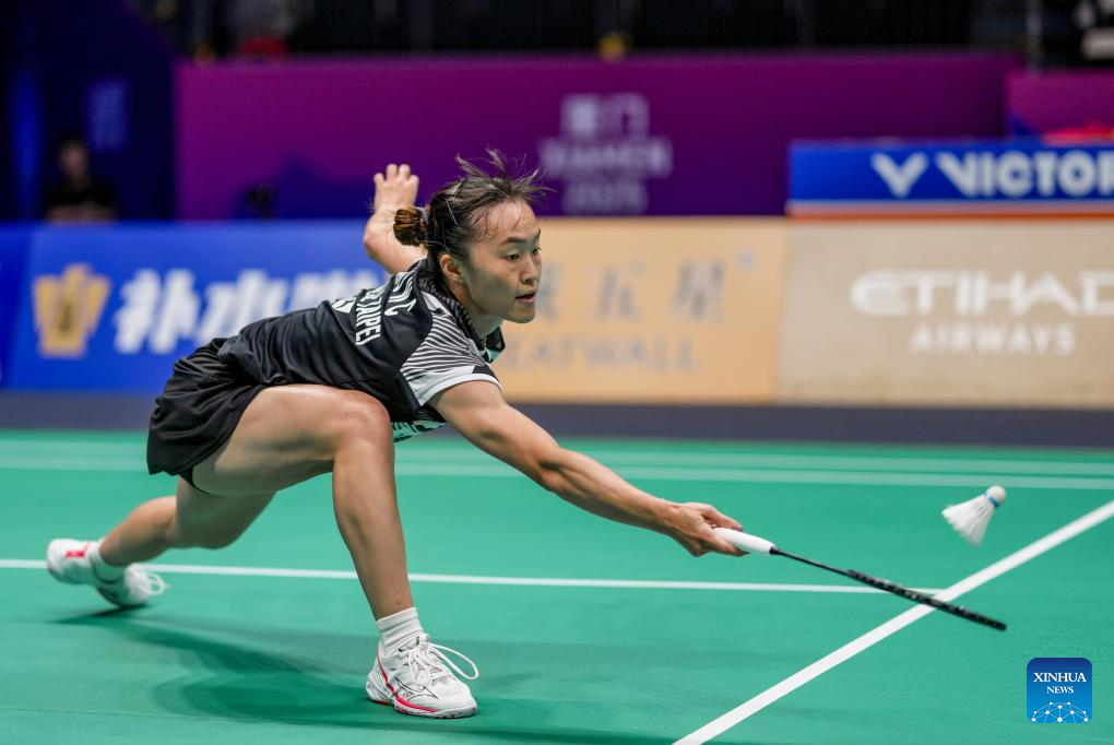 Hsu Wen Chi of Chinese Taipei hits a return in the women's singles match against Yamaguchi Akane of Japan during the quarterfinal match between Japan and Chinese Taipei at BWF Sudirman Cup in Xiamen, southeast China's Fujian Province, May 2, 2025. (Xinhua/Sun Fei)