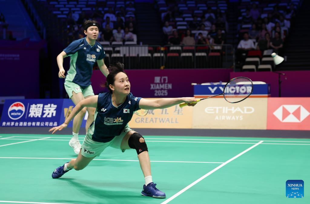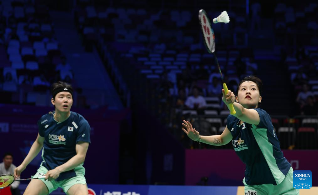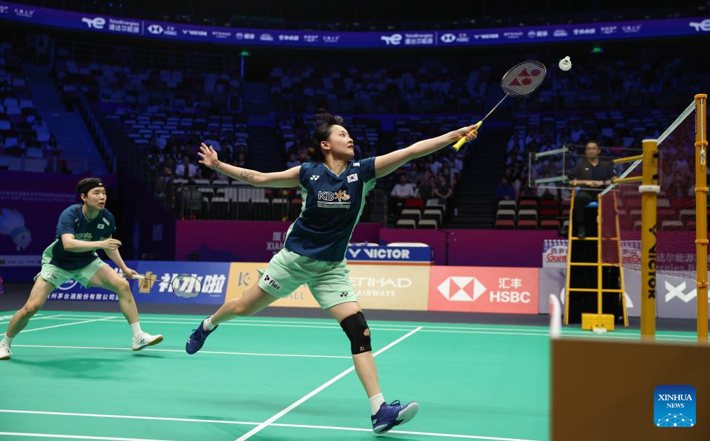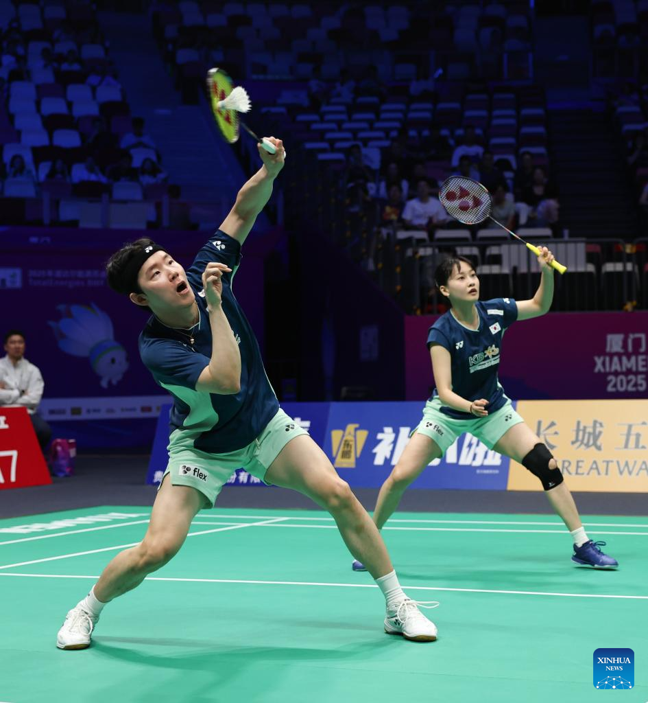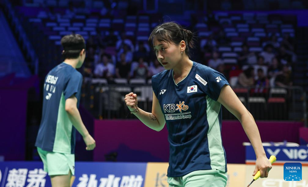 Seo Seung Jae/Chae Yu Jung (R) of South Korea compete in the mixed doubles match against Jesper Toft/Amalie Magelund of Denmark during the quarterfinal match between South Korea and Denmark at BWF Sudirman Cup in Xiamen, southeast China's Fujian Province, May 2, 2025. (Xinhua/Wang Kaiyan)