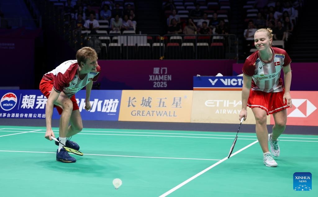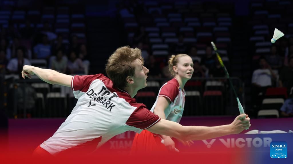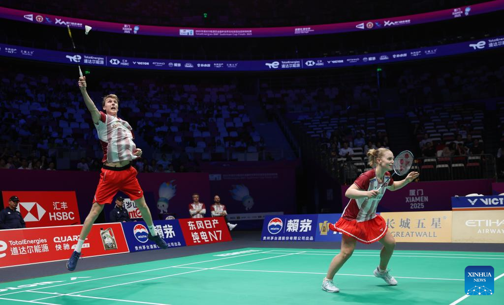Jesper Toft (L)/Amalie Magelund of Denmark compete in the mixed doubles match against Seo Seung Jae/Chae Yu Jung of South Korea during the quarterfinal match between South Korea and Denmark at BWF Sudirman Cup in Xiamen, southeast China's Fujian Province, May 2, 2025. (Xinhua/Wang Kaiyan)