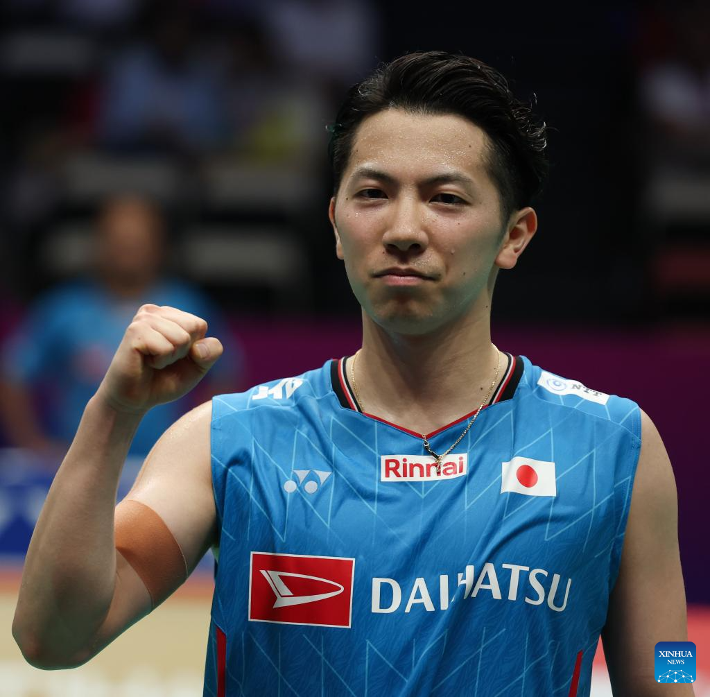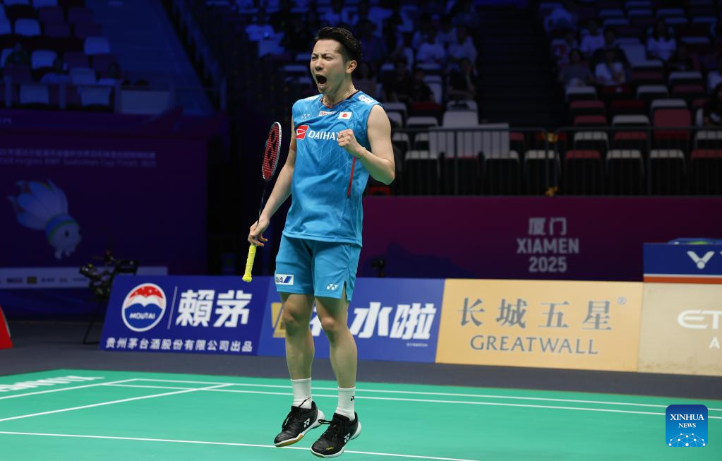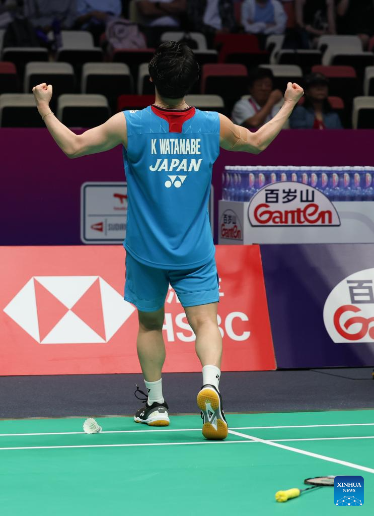 Watanabe Koki of Japan celebrates after winning the men's singles match against Chou Tien Chen of Chinese Taipei during the quarterfinal match between Japan and Chinese Taipei at BWF Sudirman Cup in Xiamen, southeast China's Fujian Province, May 2, 2025. (Xinhua/Wang Kaiyan)