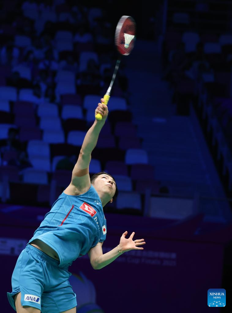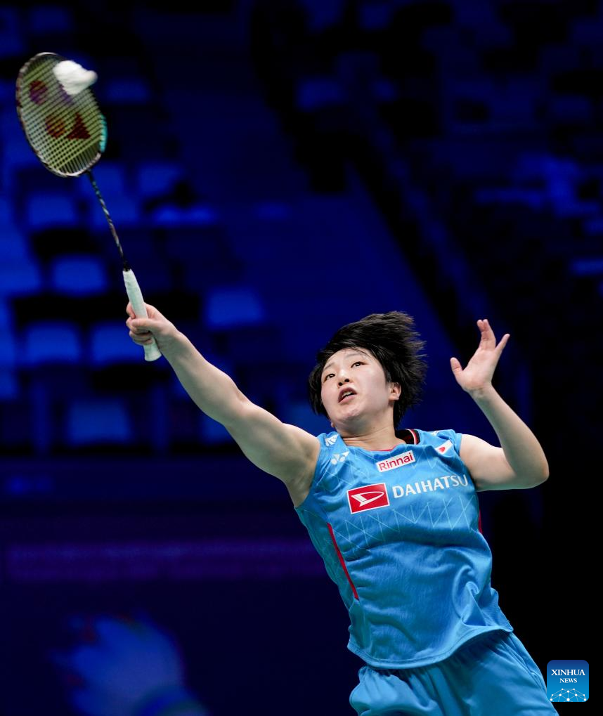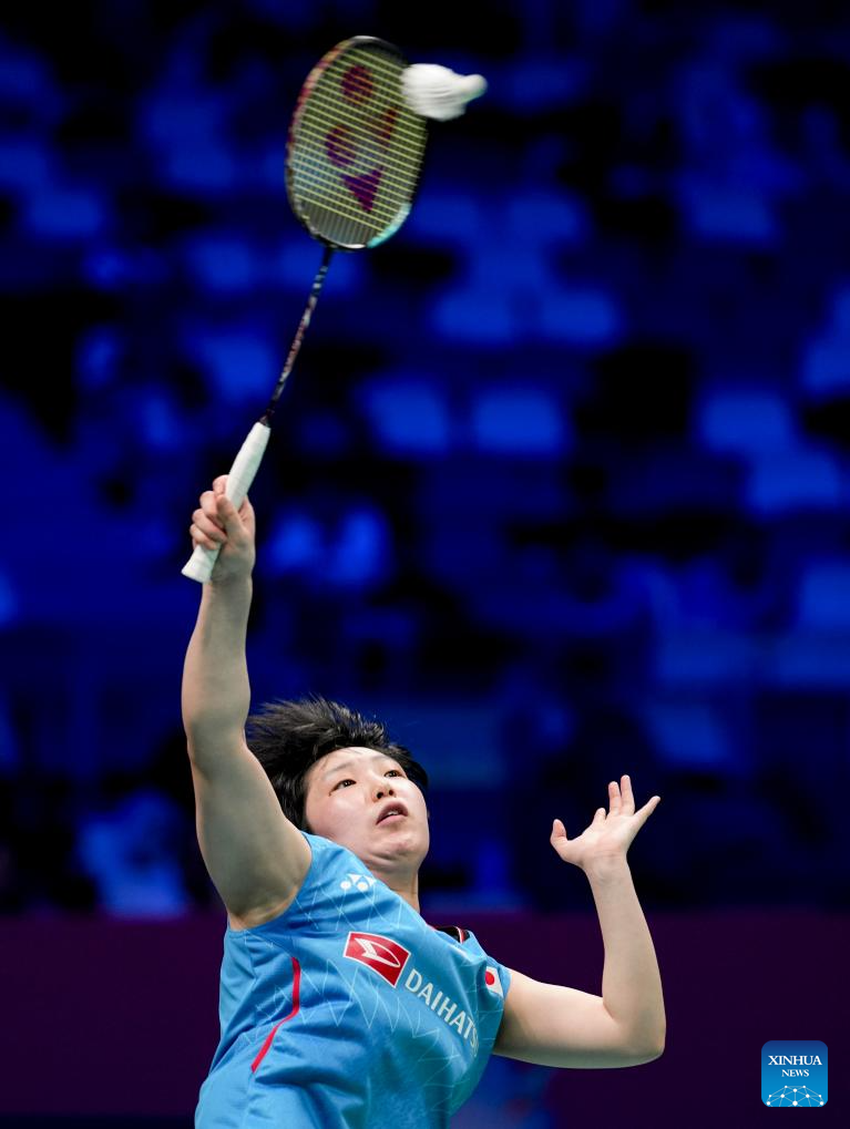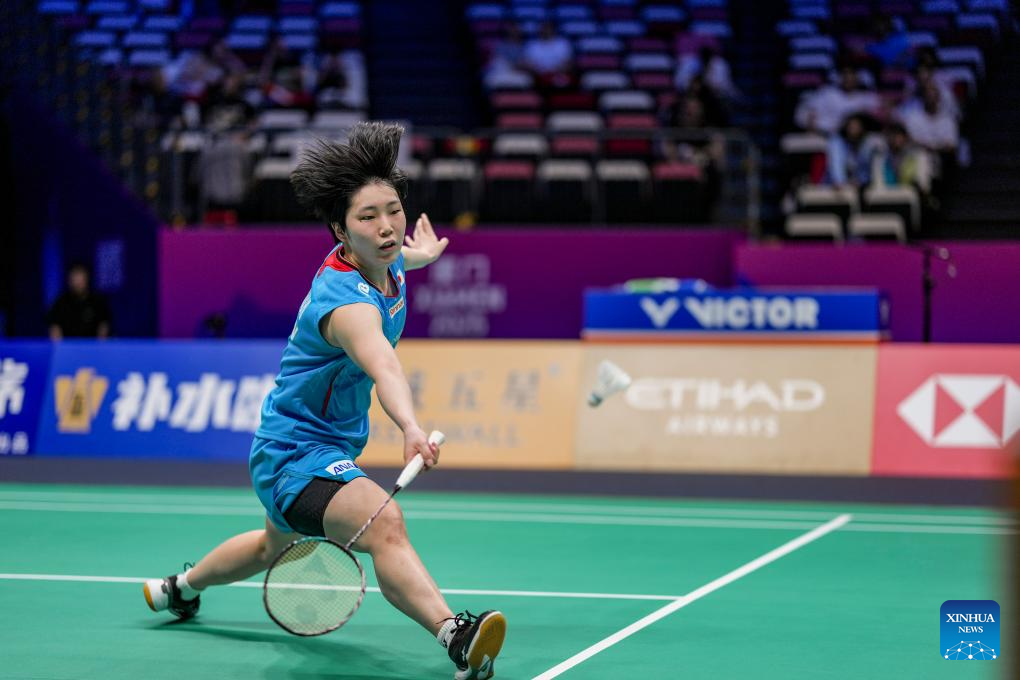 Yamaguchi Akane of Japan hits a return in the women's singles match against Hsu Wen Chi of Chinese Taipei during the quarterfinal match between Japan and Chinese Taipei at BWF Sudirman Cup in Xiamen, southeast China's Fujian Province, May 2, 2025. (Xinhua/Wei Peiquan)