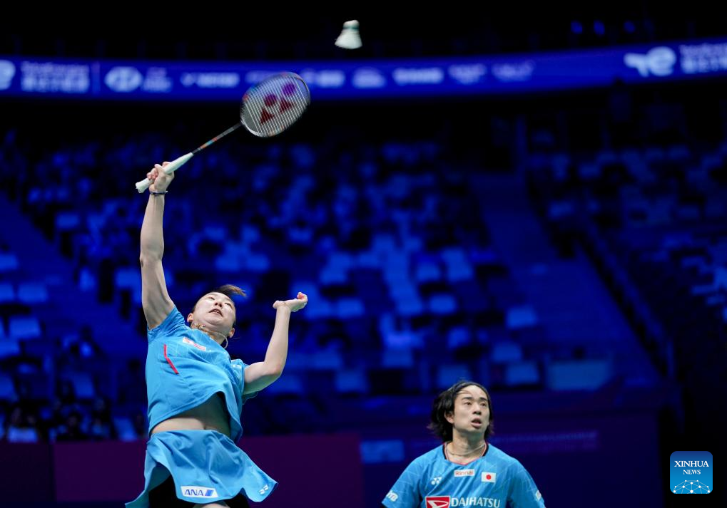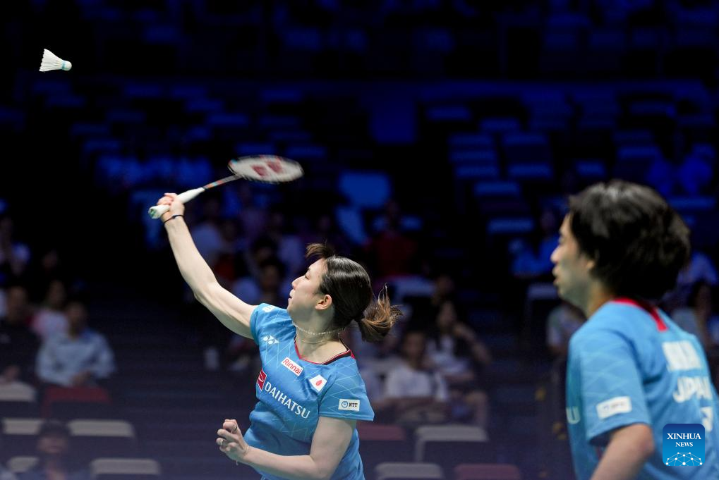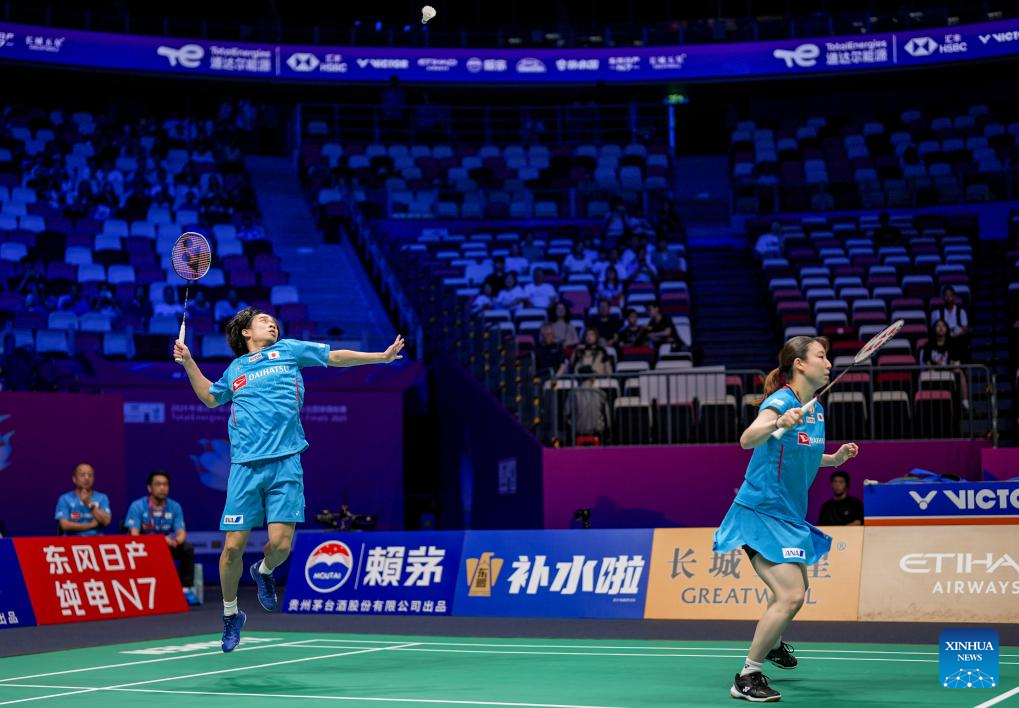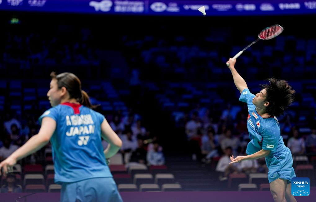 Midorikawa Hiroki (R)/Igarashi Arisa of Japan compete in the mixed doubles match against Ye Hong Wei/Hu Ling Fang of Chinese Taipei during the quarterfinal match between Japan and Chinese Taipei at BWF Sudirman Cup in Xiamen, southeast China's Fujian Province, May 2, 2025. (Xinhua/Sun Fei)