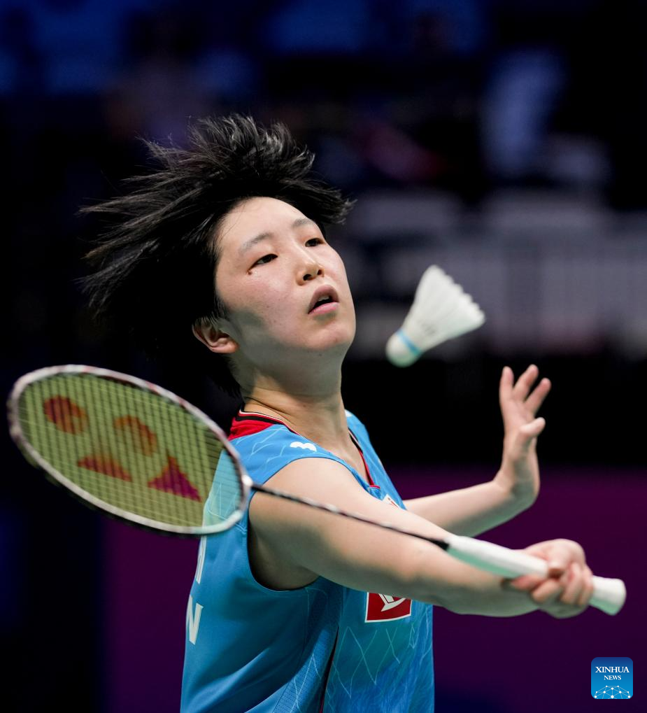 Yamaguchi Akane of Japan hits a return in the women's singles match against Hsu Wen Chi of Chinese Taipei during the quarterfinal match between Japan and Chinese Taipei at BWF Sudirman Cup in Xiamen, southeast China's Fujian Province, May 2, 2025. (Xinhua/Sun Fei)