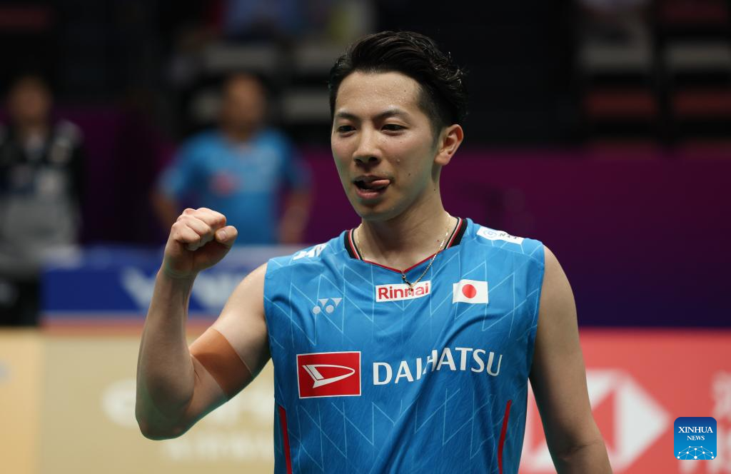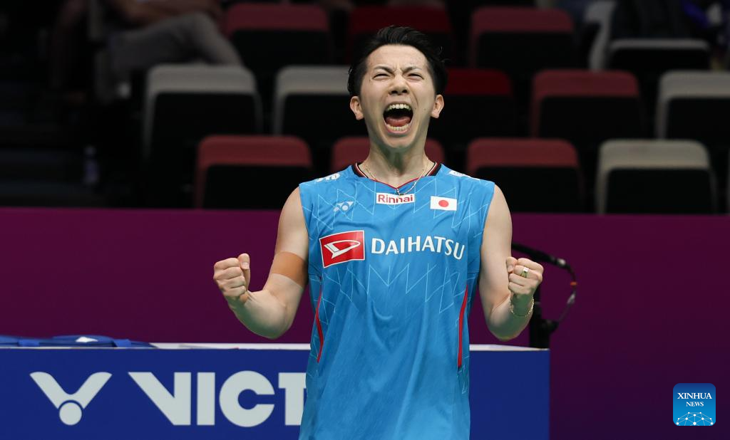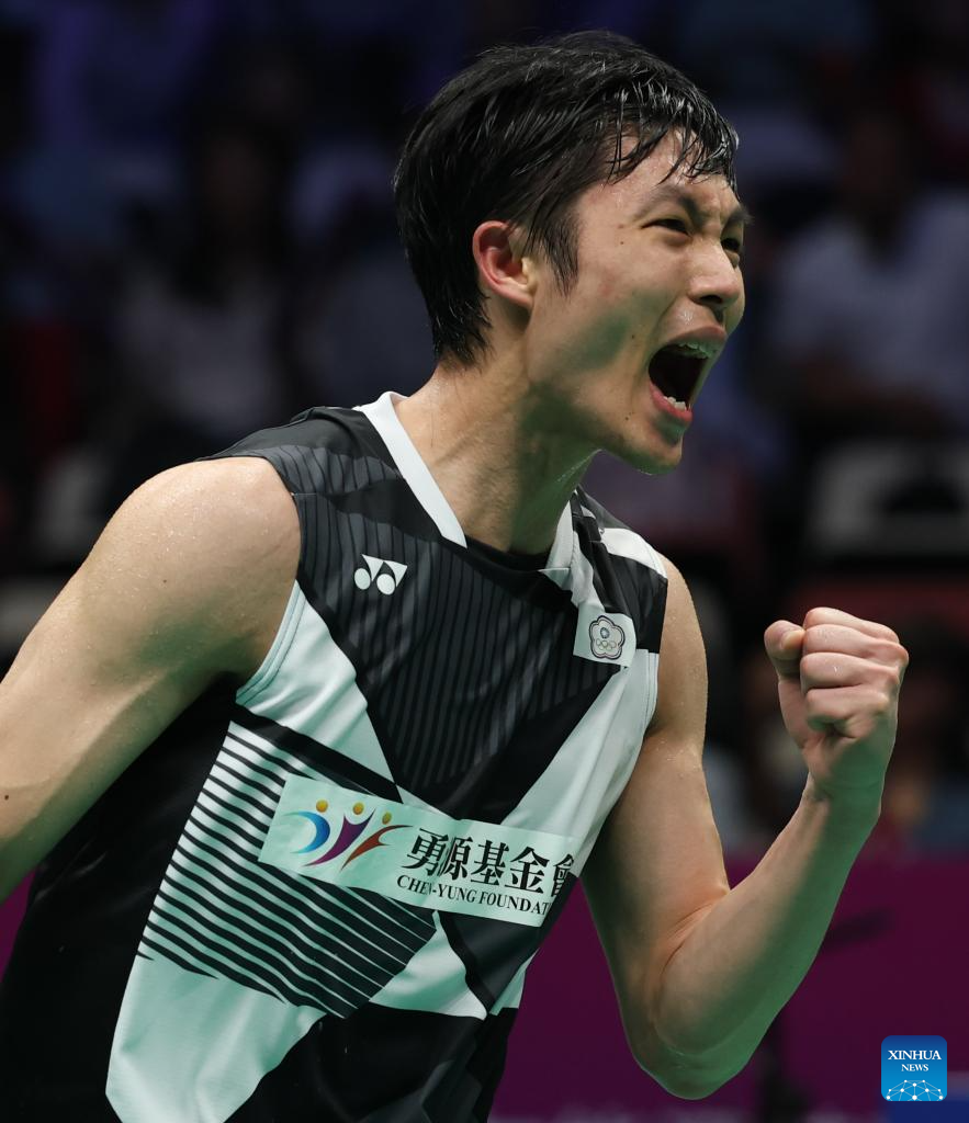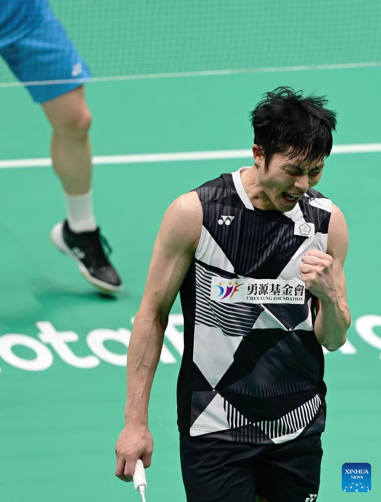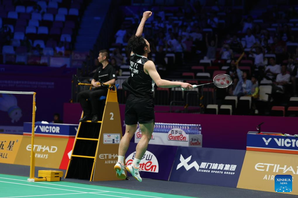 Chou Tien Chen of Chinese Taipei celebrates scoring in the men's singles match against Watanabe Koki of Japan during the quarterfinal match between Japan and Chinese Taipei at BWF Sudirman Cup in Xiamen, southeast China's Fujian Province, May 2, 2025. (Xinhua/Sun Fei)