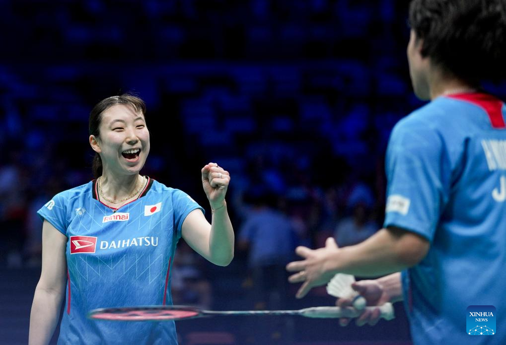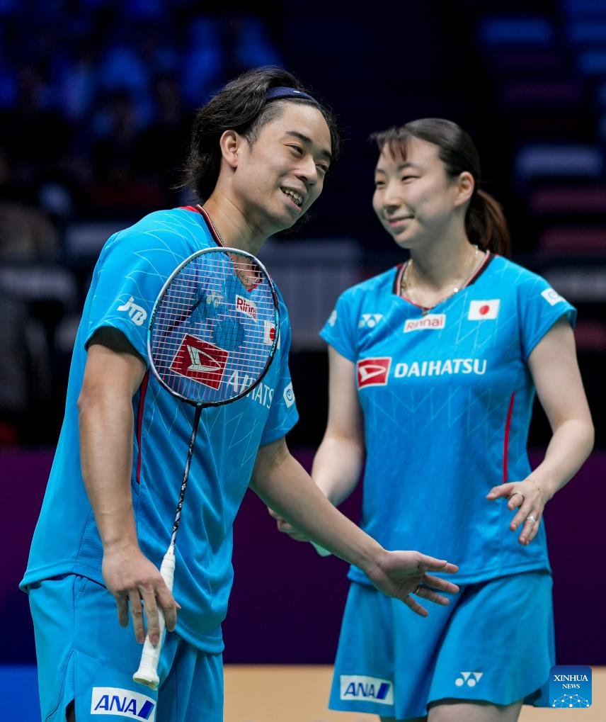 Midorikawa Hiroki/Igarashi Arisa (L) of Japan react in the mixed doubles match against Ye Hong Wei/Hu Ling Fang of Chinese Taipei during the quarterfinal match between Japan and Chinese Taipei at BWF Sudirman Cup in Xiamen, southeast China's Fujian Province, May 2, 2025. (Xinhua/Sun Fei)