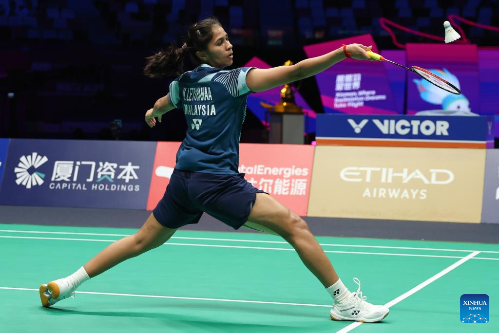 Karupathevan Letshanaa of Malaysia hits a return in the women's singles match against Chen Yufei of China during the quarterfinal match between China and Malaysia at BWF Sudirman Cup in Xiamen, southeast China's Fujian Province, May 2, 2025. (Xinhua/Wang Kaiyan)