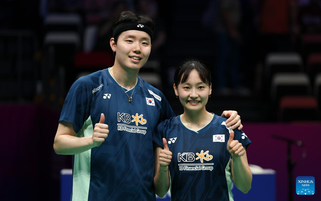 Seo Seung Jae/Chae Yu Jung (R) of South Korea celebrate after winning the mixed doubles match against Jesper Toft/Amalie Magelund of Denmark during the quarterfinal match between South Korea and Denmark at BWF Sudirman Cup in Xiamen, southeast China's Fujian Province, May 2, 2025. (Xinhua/Wang Kaiyan)