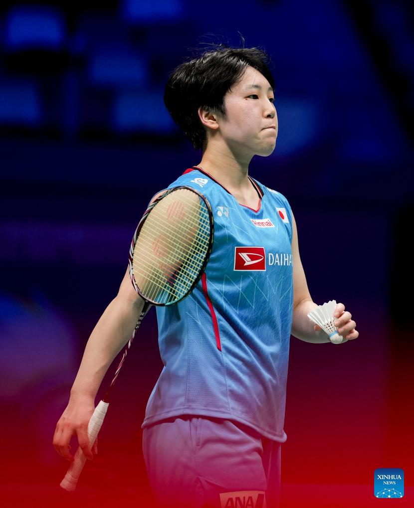 Yamaguchi Akane of Japan reacts in the women's singles match against Hsu Wen Chi of Chinese Taipei during the quarterfinal match between Japan and Chinese Taipei at BWF Sudirman Cup in Xiamen, southeast China's Fujian Province, May 2, 2025. (Xinhua/Sun Fei)