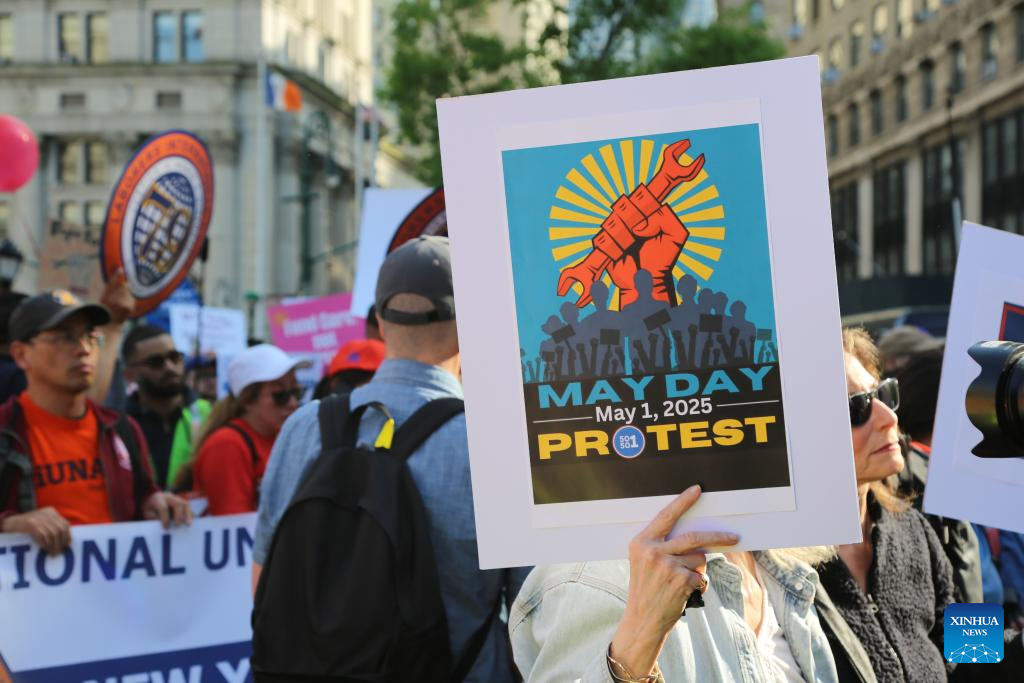 Demonstrators participate in a rally in New York City, the United States, on May 1, 2025. (Photo by Michael Nagle/Xinhua)