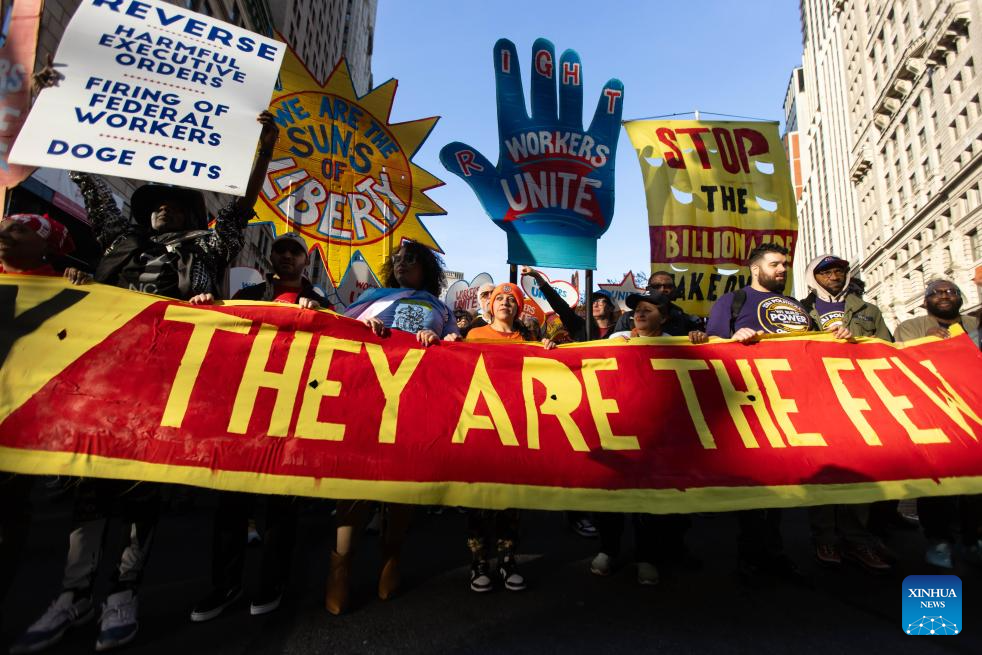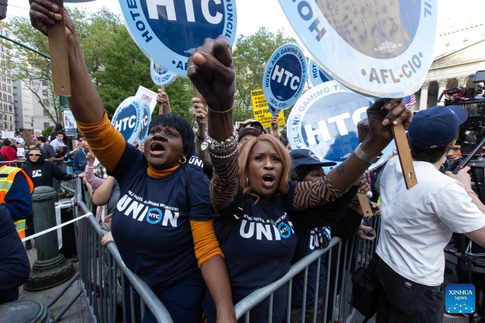 Demonstrators participate in a rally to mark the International Workers' Day in New York, the United States, on May 1, 2025. (Xinhua/Liu Yanan)