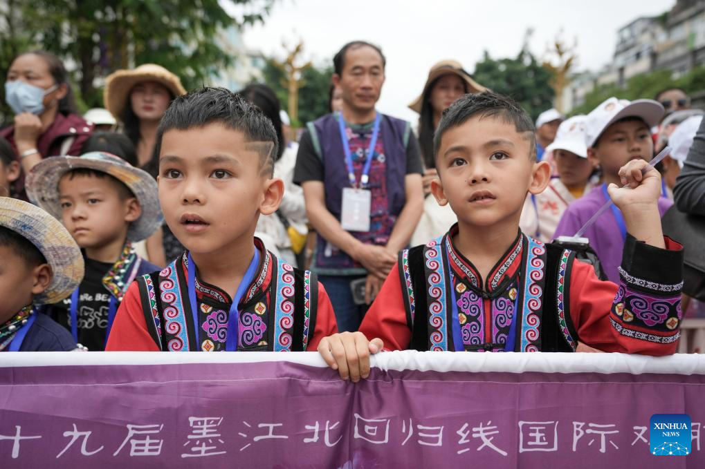 A pair of twins from Sri Lanka pose for group photos with citizens during the 19th Mojiang international twins festival in Mojiang Hani Autonomous County, southwest China's Yunnan province, May 1, 2025. Over 1,000 multiple births from around the world took part in a parade during the twins festival in Mojiang Hani Autonomous County on Thursday. (Xinhua/Chen Xinbo)