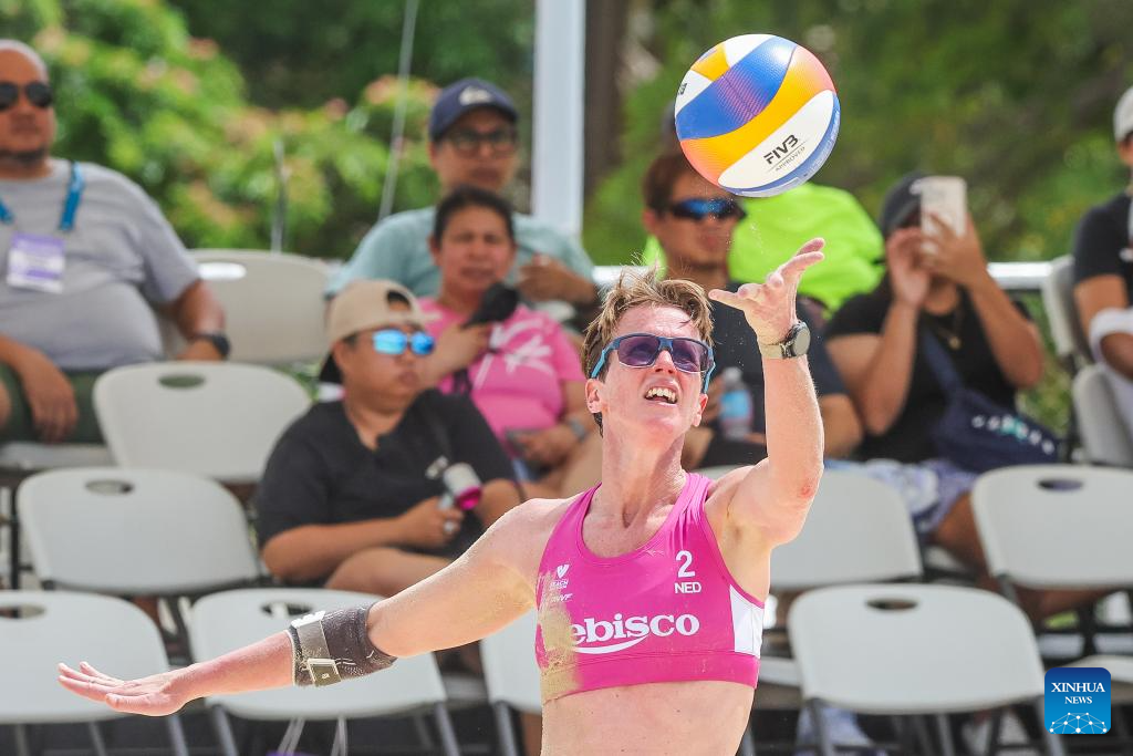 Annemieke Driessen of the Netherlands competes during the women's pool A match between Khylem Harl Progella/Sofiah Shanine Pagara of the Philippines and Annemieke Driessen/Danieke Prins of the Netherlands at the Volleyball World Beach Pro Tour Futures in Laguna Province, the Philippines, May 3, 2025. (Xinhua/Rouelle Umali)