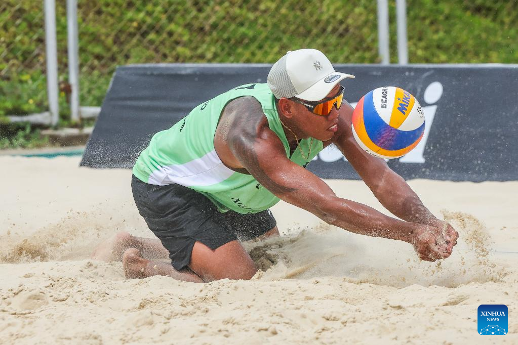 Edwin Tolentino of the Philippines competes during the men's pool C match between Edwin Tolentino/Lerry John Francisco of the Philippines and Eduards Dudens/Ralfs Andrejevs of Latvia at the Volleyball World Beach Pro Tour Futures in Laguna Province, the Philippines, May 3, 2025. (Xinhua/Rouelle Umali)