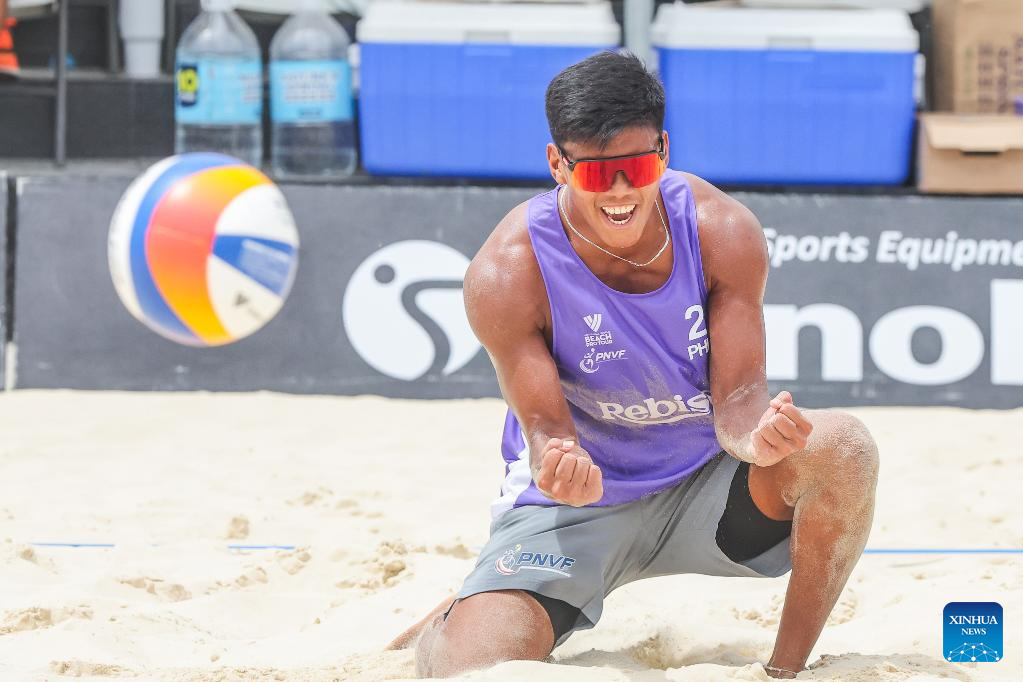 Rancel Varga of the Philippines celebrates after scoring a point during the men's pool D match between James Buytrago/Rancel Varga of the Philippines and Domonkos Doczi/Bence Attila Streli of Hungary at the Volleyball World Beach Pro Tour Futures in Laguna Province, the Philippines, May 3, 2025. (Xinhua/Rouelle Umali)