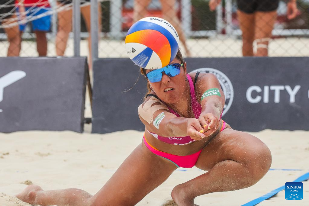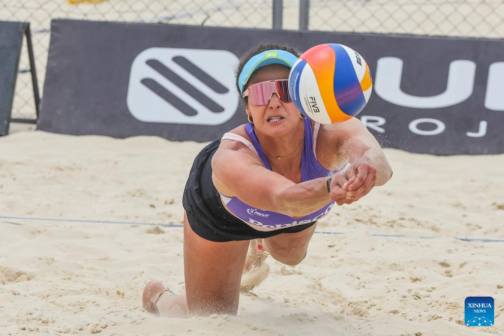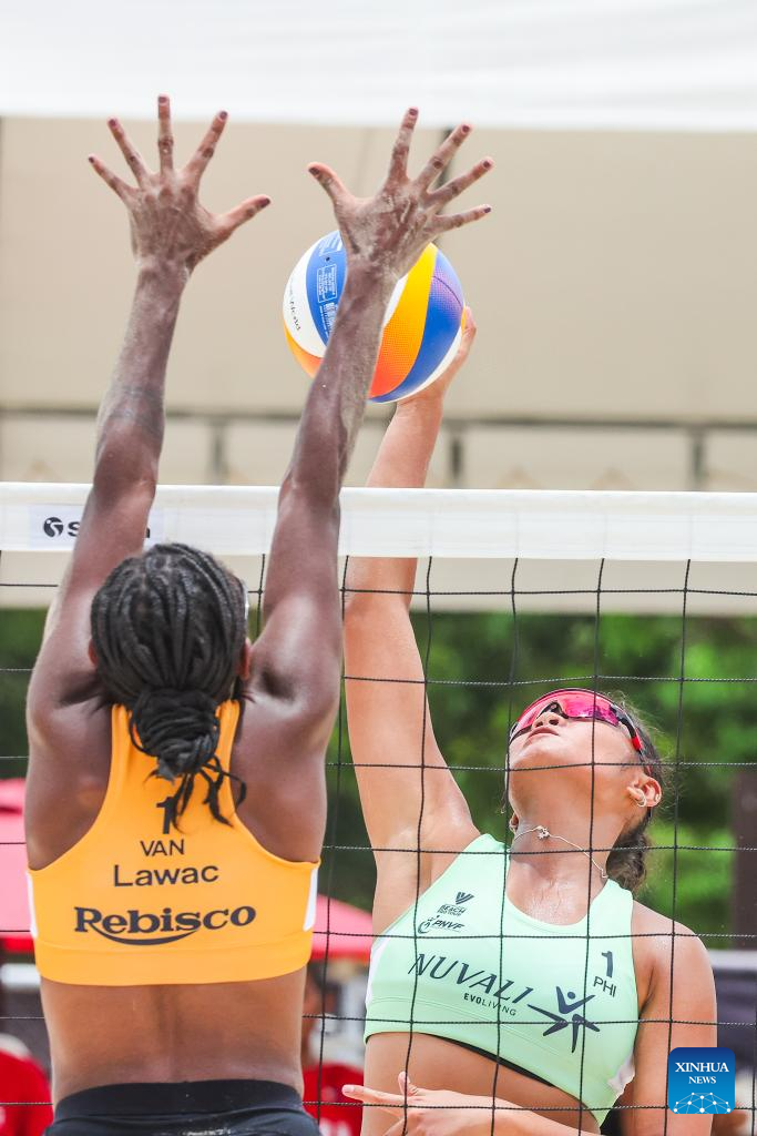 Honey Grace Cordero of the Philippines competes during the women's round of 12 match between Beata Vaida/Francesca Ioana Alupei of Romania and Kathrina Epa/Honey Grace Cordero of the Philippines at the Volleyball World Beach Pro Tour Futures in Laguna Province, the Philippines, May 3, 2025. (Xinhua/Rouelle Umali)