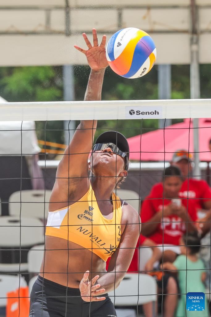 Sherysyn Toko of Vanuatu competes during the women's round of 12 match between Majabelle Lawac/Sherysyn Toko of Vanuatu and Khylem Harl Progella/Sofiah Shanine Pagara of the Philippines at the Volleyball World Beach Pro Tour Futures in Laguna Province, the Philippines, May 3, 2025. (Xinhua/Rouelle Umali)