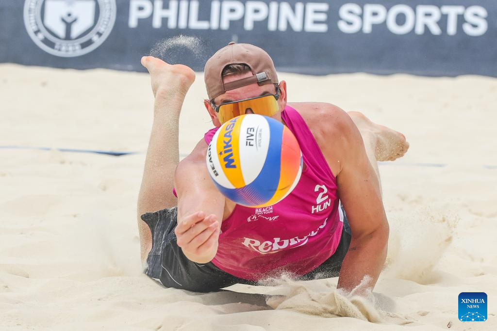 Bence Attila Streli of Hungary competes during the men's pool D match between James Buytrago/Rancel Varga of the Philippines and Domonkos Doczi/Bence Attila Streli of Hungary at the Volleyball World Beach Pro Tour Futures in Laguna Province, the Philippines, May 3, 2025. (Xinhua/Rouelle Umali)
