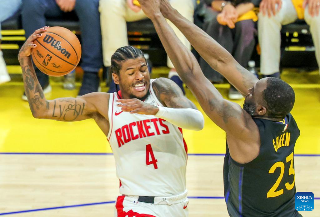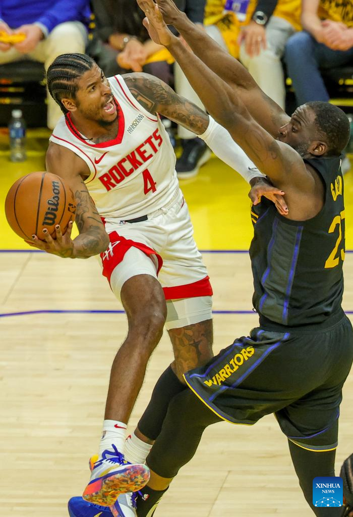 Jalen Green (L) of Houston Rockets competes during the first-round match between Golden State Warriors and Houston Rockets of the 2024-2025 NBA Playoffs in San Francisco, the United States, May 2, 2025. (Photo by Arthur Dong/Xinhua)