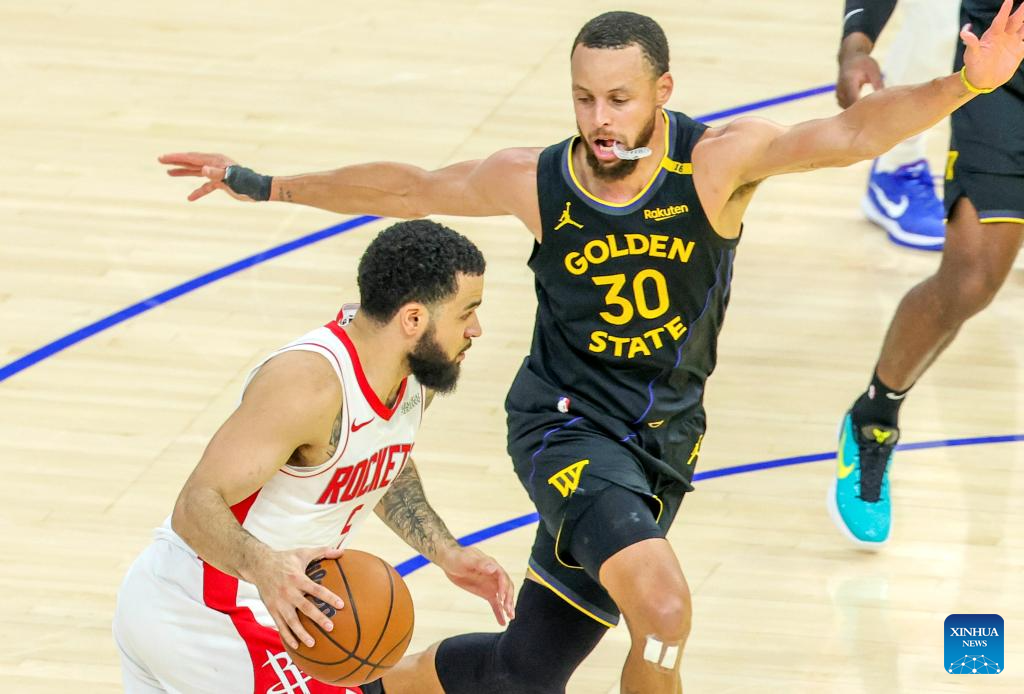 Stephen Curry (R) of Golden State Warriors defends during the first-round match between Golden State Warriors and Houston Rockets of the 2024-2025 NBA Playoffs in San Francisco, the United States, May 2, 2025. (Photo by Arthur Dong/Xinhua)