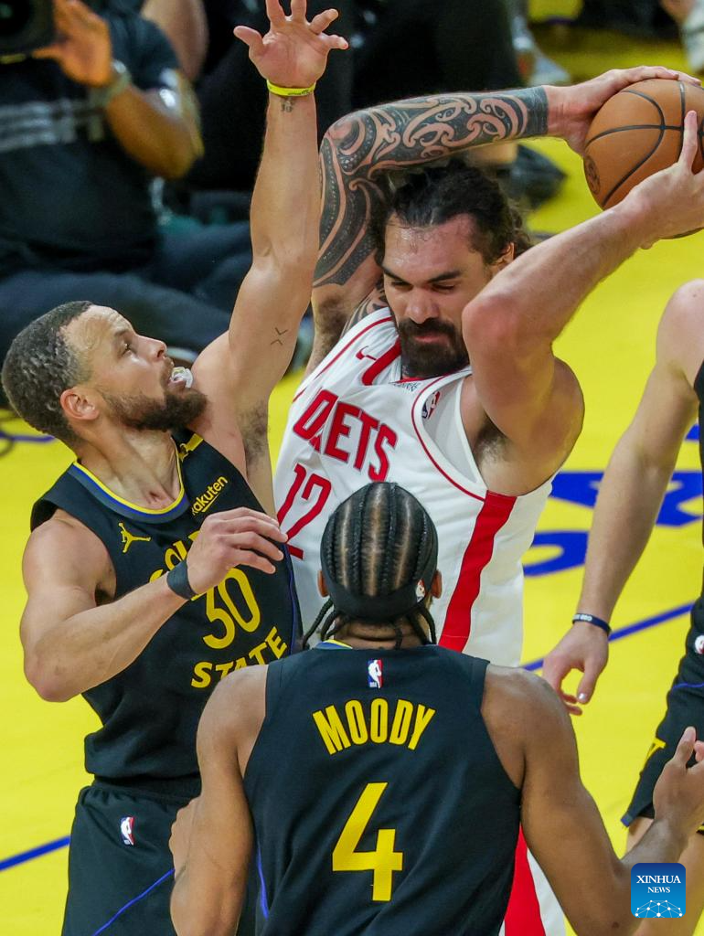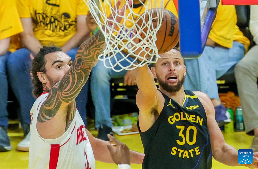 Stephen Curry (R) of Golden State Warriors competes during the first-round match between Golden State Warriors and Houston Rockets of the 2024-2025 NBA Playoffs in San Francisco, the United States, May 2, 2025. (Photo by Arthur Dong/Xinhua)