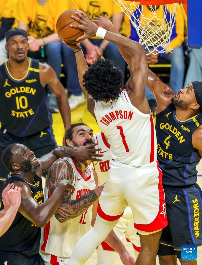 Moses Moody (1st R) of Golden State Warriors vies with Amen Thompson (2nd R) of Houston Rockets during the first-round match between Golden State Warriors and Houston Rockets of the 2024-2025 NBA Playoffs in San Francisco, the United States, May 2, 2025. (Photo by Arthur Dong/Xinhua)