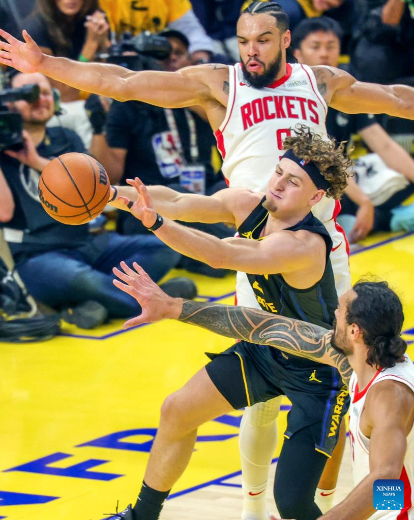 Brandin Podziemski (C) of Golden State Warriors competes during the first-round match between Golden State Warriors and Houston Rockets of the 2024-2025 NBA Playoffs in San Francisco, the United States, May 2, 2025. (Photo by Arthur Dong/Xinhua)