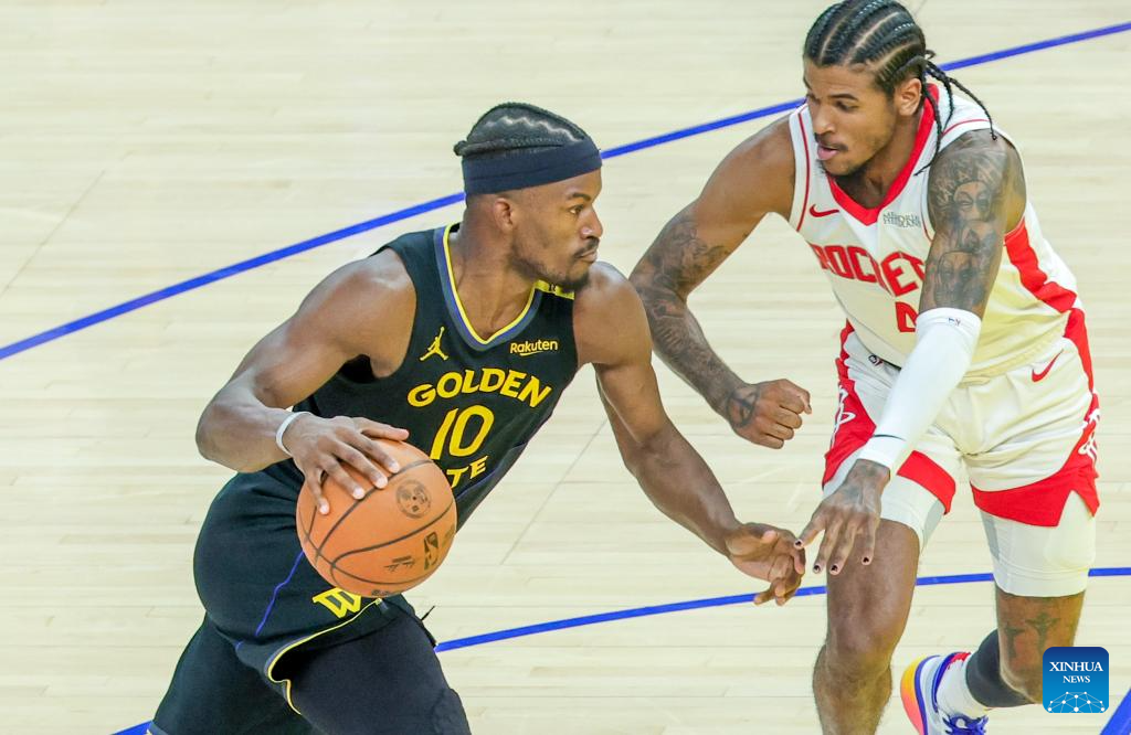 Jimmy Butler (L) of Golden State Warriors competes during the first-round match between Golden State Warriors and Houston Rockets of the 2024-2025 NBA Playoffs in San Francisco, the United States, May 2, 2025. (Photo by Arthur Dong/Xinhua)