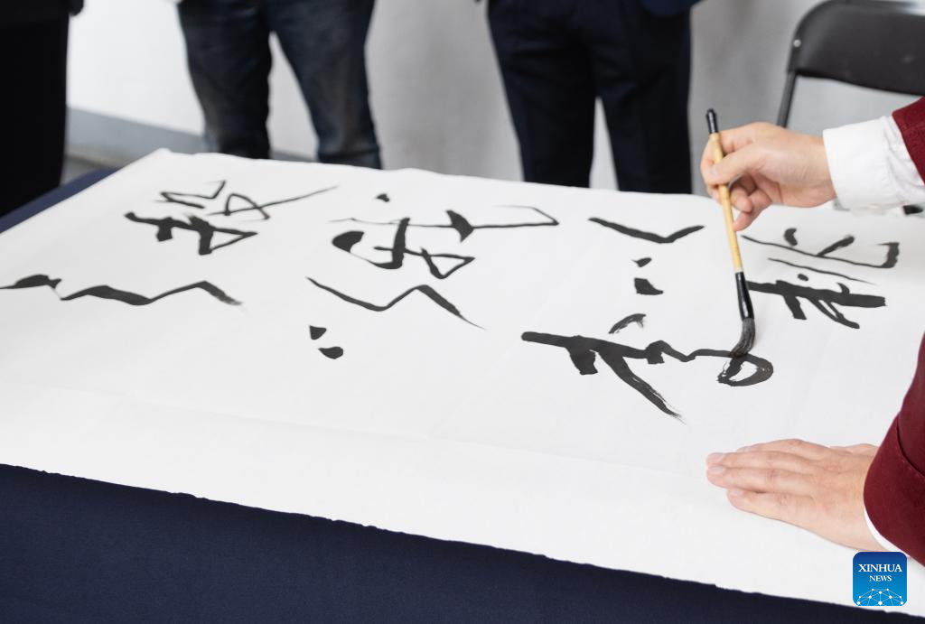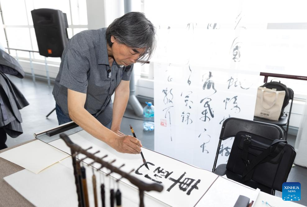 A Chinese guest demonstrates calligraphy skills at a Chinese calligraphy exhibition in Mexico City, capital of Mexico, on May 3, 2025. A Chinese calligraphy exhibition under the framework of the "Lanting" Culture Salon events opened here on Saturday.
