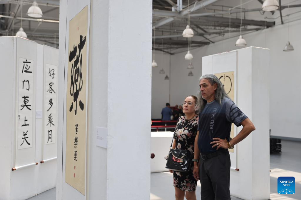 Visitors admire calligraphy works at a Chinese calligraphy exhibition in Mexico City, capital of Mexico, on May 3, 2025. A Chinese calligraphy exhibition under the framework of the "Lanting" Culture Salon events opened here on Saturday.