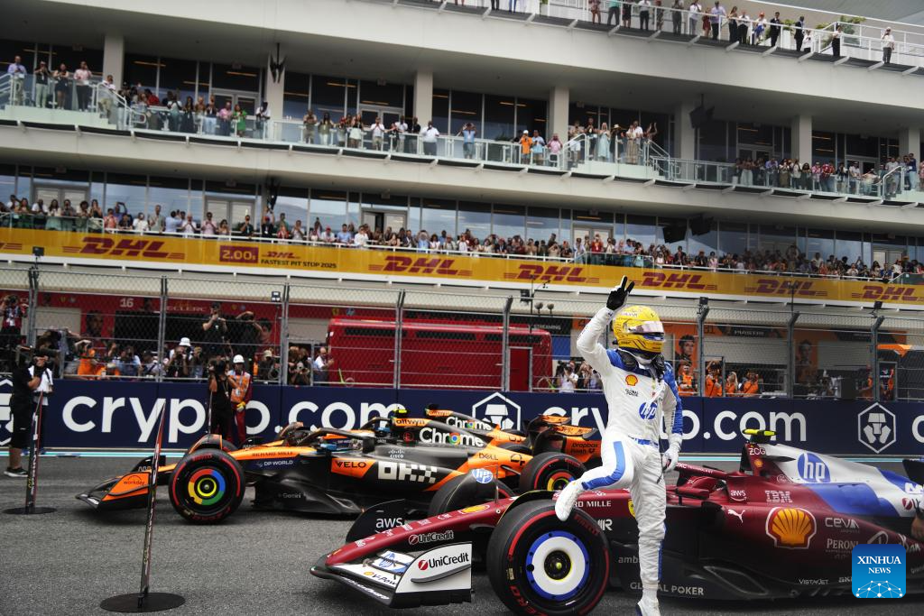 Drivers compete during the sprint race of the Formula One Miami Grand Prix at Miami International Autodrome in Miami, United States, May 3, 2025. (Xinhua/Wu Xiaoling)