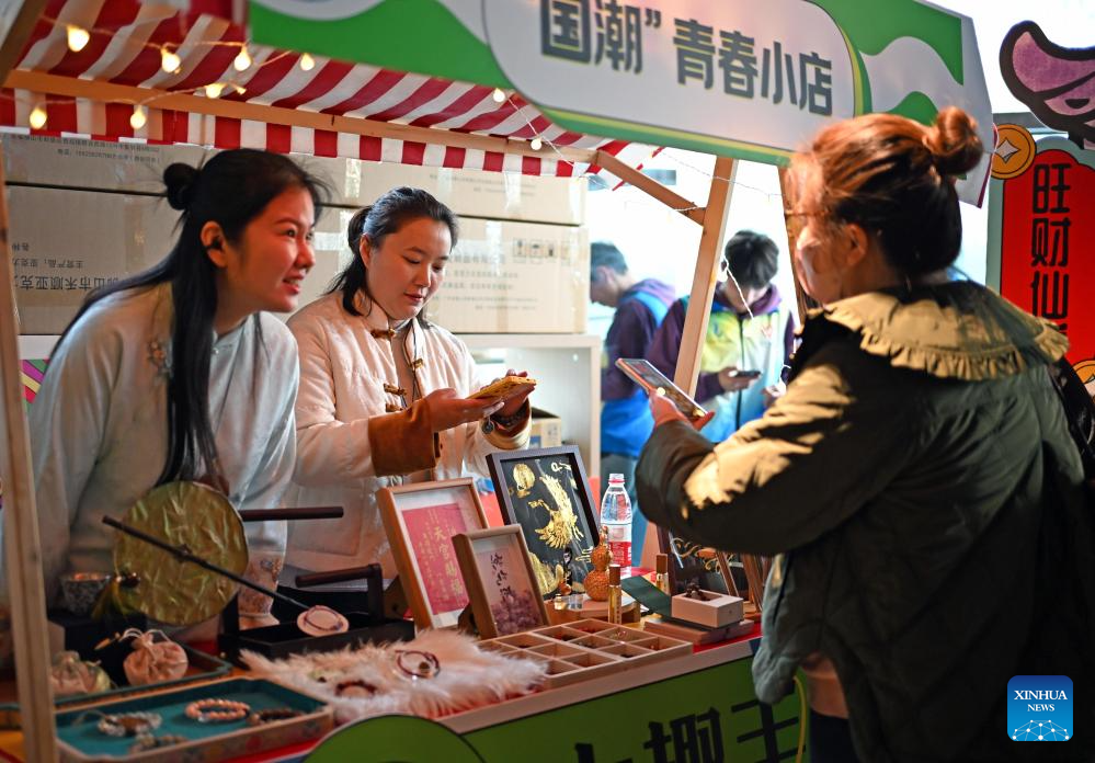 Si Fangfang (2nd L) and Li Wen (1st L) introduce their studio "Jinkun Xinshe" at a promotion event for shops featuring traditional Chinese culture in Shanghai, east China, March 12, 2025. "Jinkun Xinshe" was founded by Si Fangfang and Li Wen, who have converted a foreign-style house into a tranquil and elegant space to offer traditional handicraft courses such as bracelet making, rope braiding, incense crafting, and gold foil painting.(Xinhua/Liu Ying)