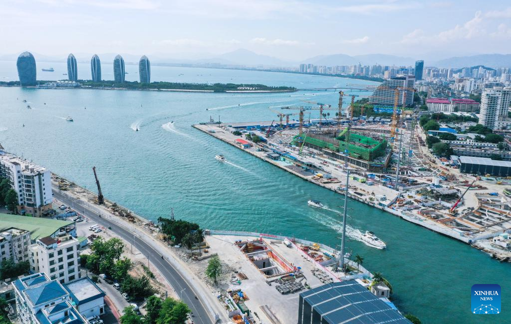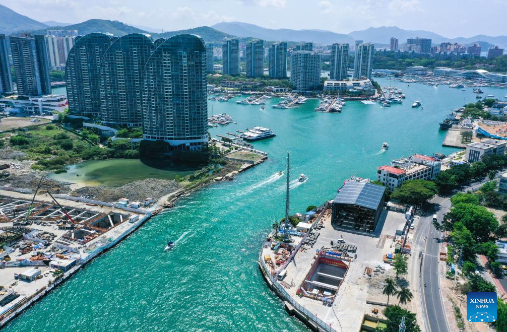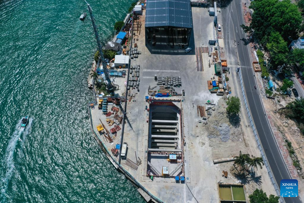 An aerial drone photo taken on May 5, 2025 shows the construction site of the Sanya River estuary passage project in Sanya, south China's Hainan Province. As the first underwater tunnel in Sanya, the project undertaken by China Railway 20th Bureau Group is making steady progress. It will further optimize the spatial layout of Sanya City once completed. (Xinhua/Zhao Yingquan)