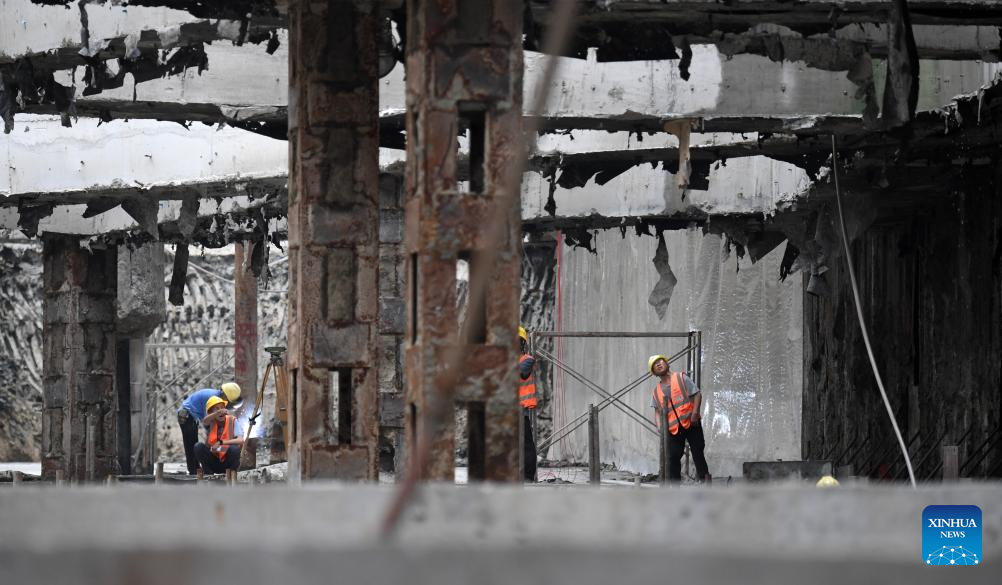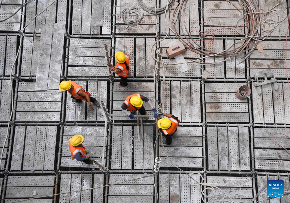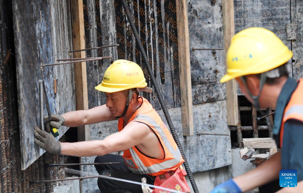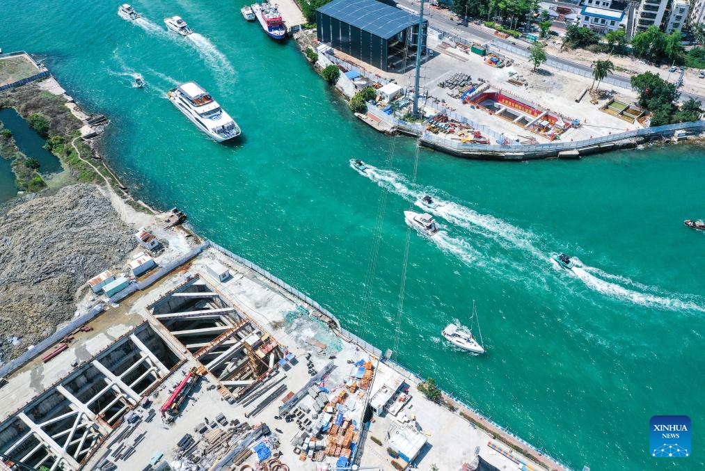 Workers work at the construction site of the Sanya River estuary passage project in Sanya, south China's Hainan Province, May 5, 2025. As the first underwater tunnel in Sanya, the project undertaken by China Railway 20th Bureau Group is making steady progress. It will further optimize the spatial layout of Sanya City once completed. (Xinhua/Zhao Yingquan)