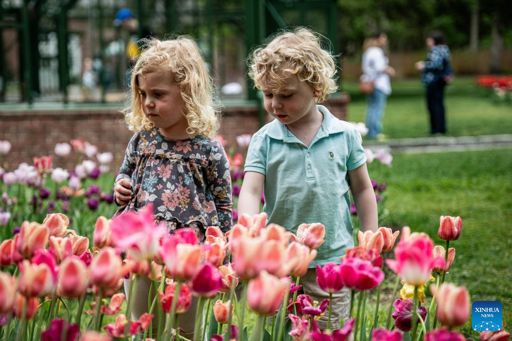 Kids look at tulips at the third annual Tulips Mania in Wellesley, Massachusetts, the United States, on May 4, 2025. More than 75,000 tulips were displayed for this event. (Photo by Ziyu Julian Zhu/Xinhua)