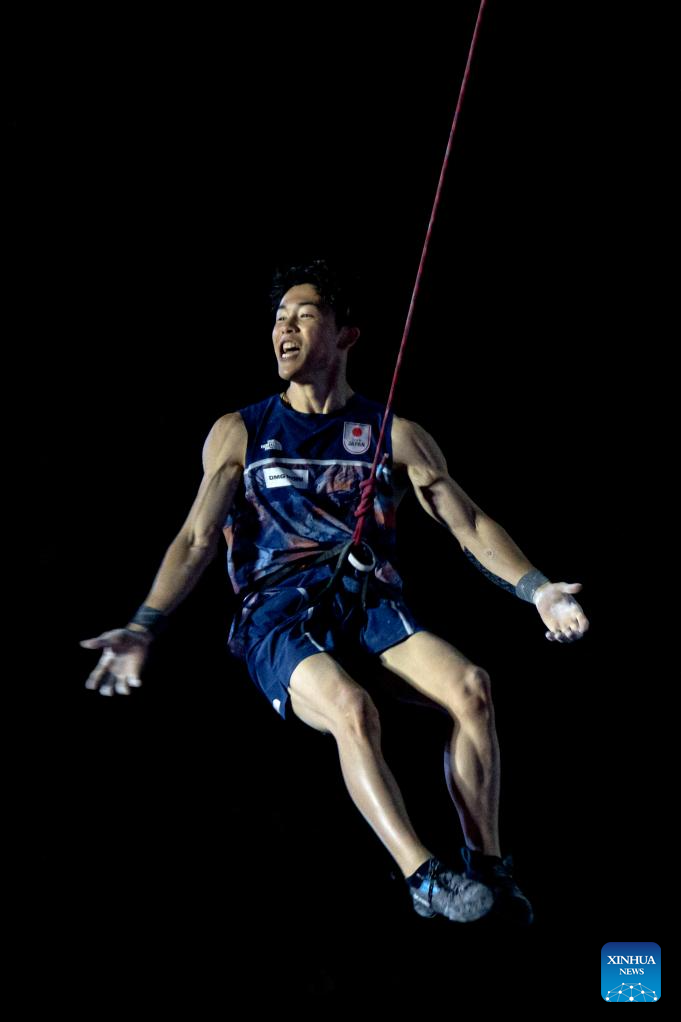 Yoshida Satone of Japan reacts after winning the men's lead final at the IFSC Climbing World Cup Bali 2025 in Bali, Indonesia, May 4, 2025. (Photo by Dicky Bisinglasi/Xinhua)