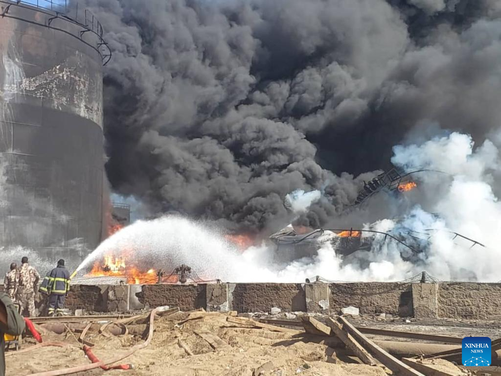Firefighters battle a fire after a drone attack on a fuel depot in Port Sudan, eastern Sudan, on May 6, 2025. The drone attacks on Tuesday struck strategic sites in Port Sudan, a port city on the Red Sea in eastern Sudan, including the international airport, a hotel near the temporary presidential palace, and an oil export port, according to eyewitnesses. (Sudanese Ministry of Culture and Information/Handout via Xinhua)