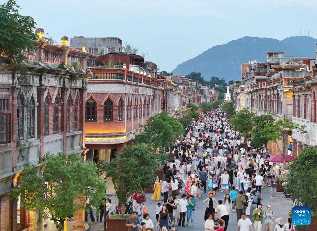 An aerial drone photo shows tourists visiting Zhongshan Road in Quanzhou, southeast China's Fujian Province, May 3, 2025. During the five-day May Day holiday, Chinese travelers took an estimated 314 million domestic trips, marking a 6.4 percent increase from the previous year, according to figures released by the Ministry of Culture and Tourism.