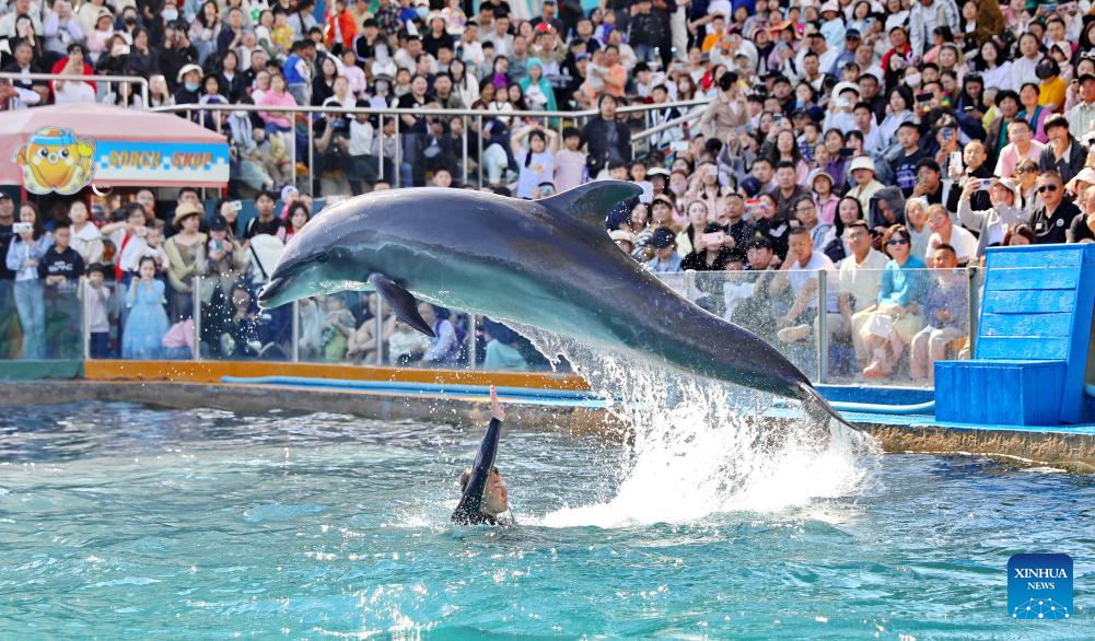 Tourists enjoy a dolphin performance in Qinhuangdao, north China's Hebei Province, May 3, 2025. During the five-day May Day holiday, Chinese travelers took an estimated 314 million domestic trips, marking a 6.4 percent increase from the previous year, according to figures released by the Ministry of Culture and Tourism.