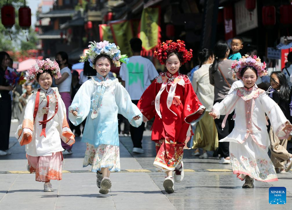 Children wearing traditional Chinese costumes enjoy leisure time in an ancient town in Xuchang, central China's Henan Province, May 1, 2025.