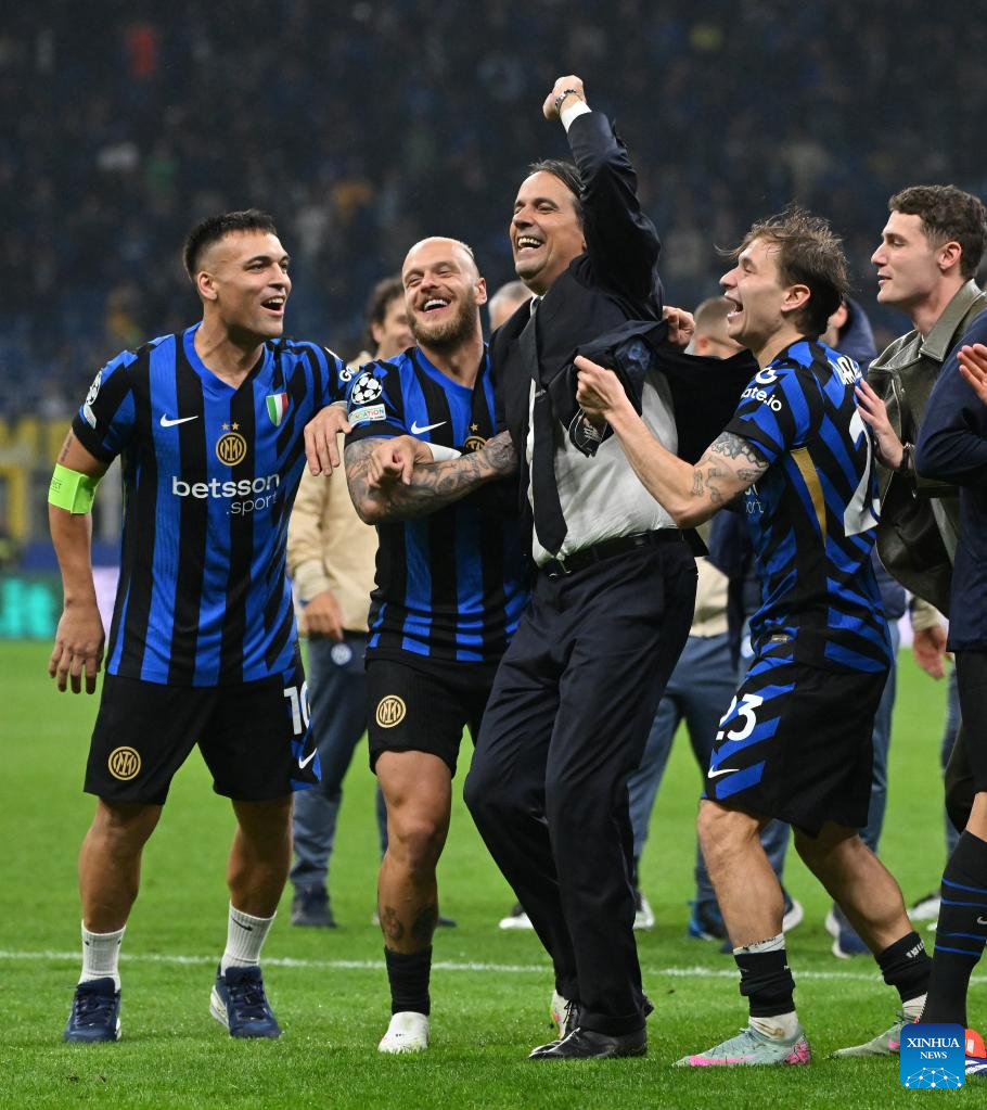 Inter Milan's head coach Simone Inzaghi (C) celebrates at the end of the UEFA Champions League semifinal second leg match between Inter Milan and Barcelona in Milan, Italy, May 6, 2025. (Photo by Alberto Lingria/Xinhua)