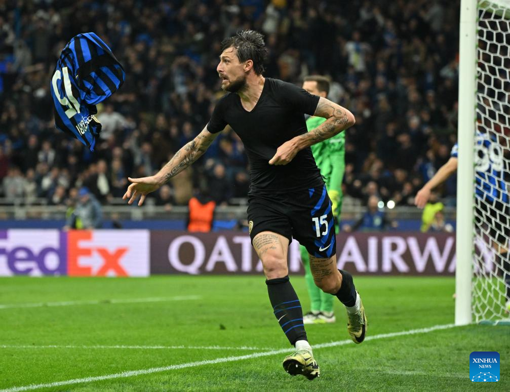 Inter Milan's Francesco Acerbi celebrates scoring during the UEFA Champions League semifinal second leg match between Inter Milan and Barcelona in Milan, Italy, May 6, 2025. (Photo by Alberto Lingria/Xinhua)