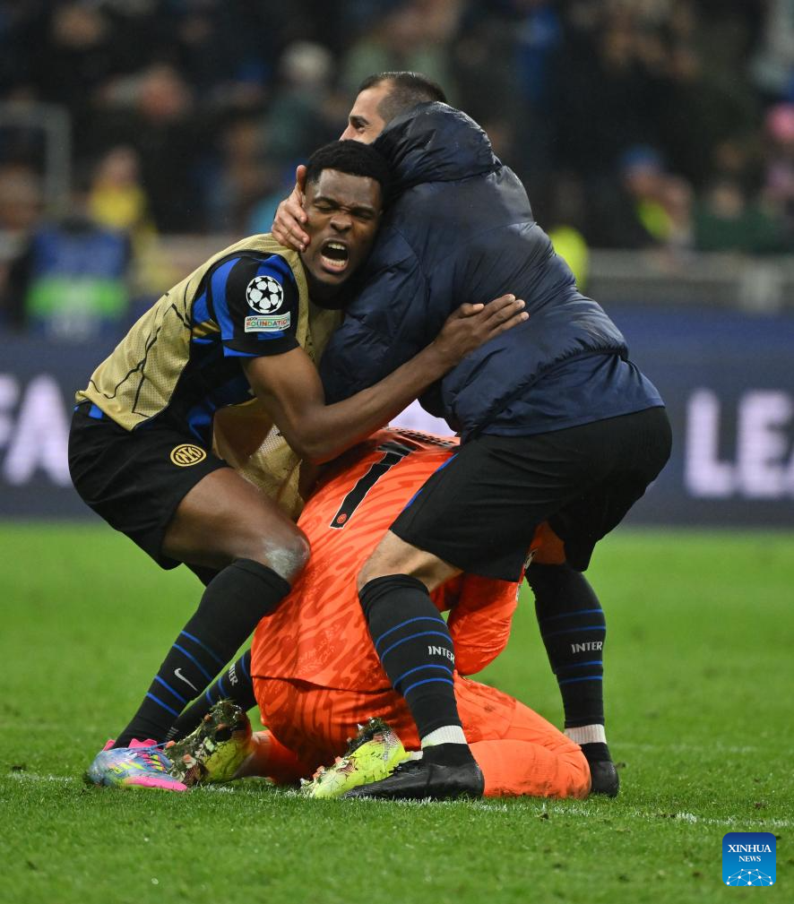 Inter Milan's Denzel Dumfries (L) and goalkeeper Yann Sommer (C) celebrate at the end of the UEFA Champions League semifinal second leg match between Inter Milan and Barcelona in Milan, Italy, May 6, 2025. (Photo by Alberto Lingria/Xinhua)
