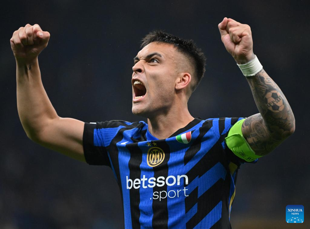Inter Milan's Lautaro Martinez celebrates at the end of the UEFA Champions League semifinal second leg match between Inter Milan and Barcelona in Milan, Italy, May 6, 2025. (Photo by Alberto Lingria/Xinhua)
