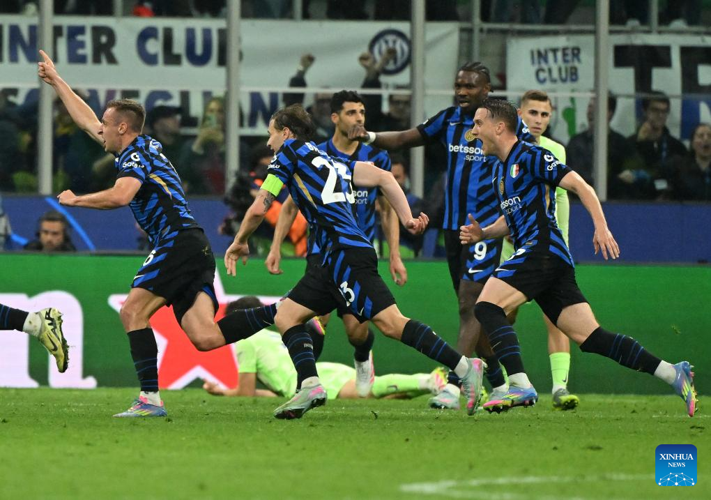 Inter Milan's Davide Frattesi (1st L) celebrates scoring during the UEFA Champions League semifinal second leg match between Inter Milan and Barcelona in Milan, Italy, May 6, 2025. (Photo by Alberto Lingria/Xinhua)