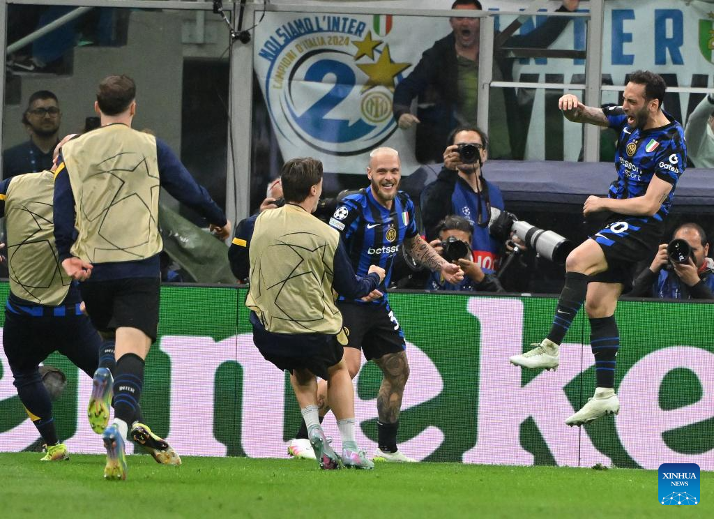 Inter Milan's Hakan Calhanoglu (1st R) celebrates scoring during the UEFA Champions League semifinal second leg match between Inter Milan and Barcelona in Milan, Italy, May 6, 2025. (Photo by Alberto Lingria/Xinhua)