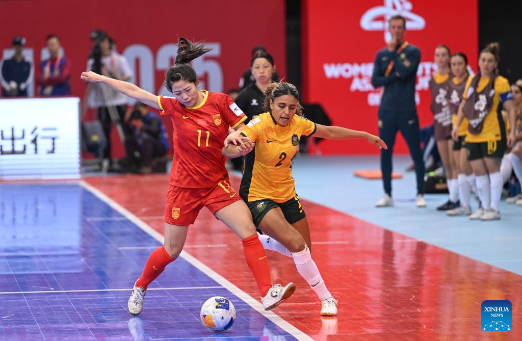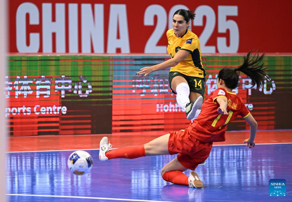 Australia's Claudia Fruscalzo (L) and China's Xiong Jing competes during the group A match between China and Australia of the AFC Women's Futsal Asian Cup in Hohhot, north China's Inner Mongolia Autonomous Region, on May 6, 2025. (Xinhua/Bei He)