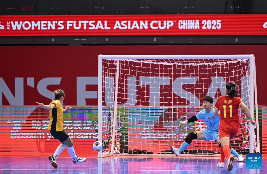 Australia's Alexia Karrys-Stahl (L) scores during the group A match between China and Australia of the AFC Women's Futsal Asian Cup in Hohhot, north China's Inner Mongolia Autonomous Region, on May 6, 2025. (Xinhua/Bei He)