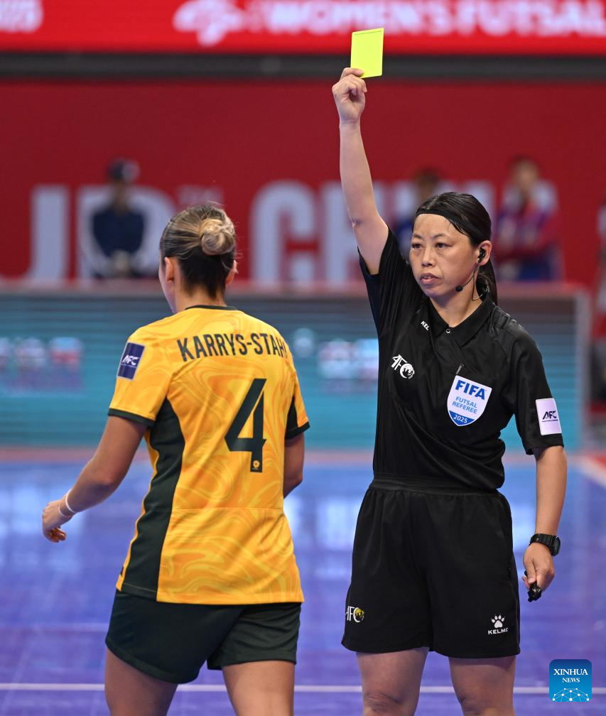 Australia's Alexia Karrys-Stahl (L) gets a yellow card during the group A match between China and Australia of the AFC Women's Futsal Asian Cup in Hohhot, north China's Inner Mongolia Autonomous Region, on May 6, 2025. (Xinhua/Bei He)