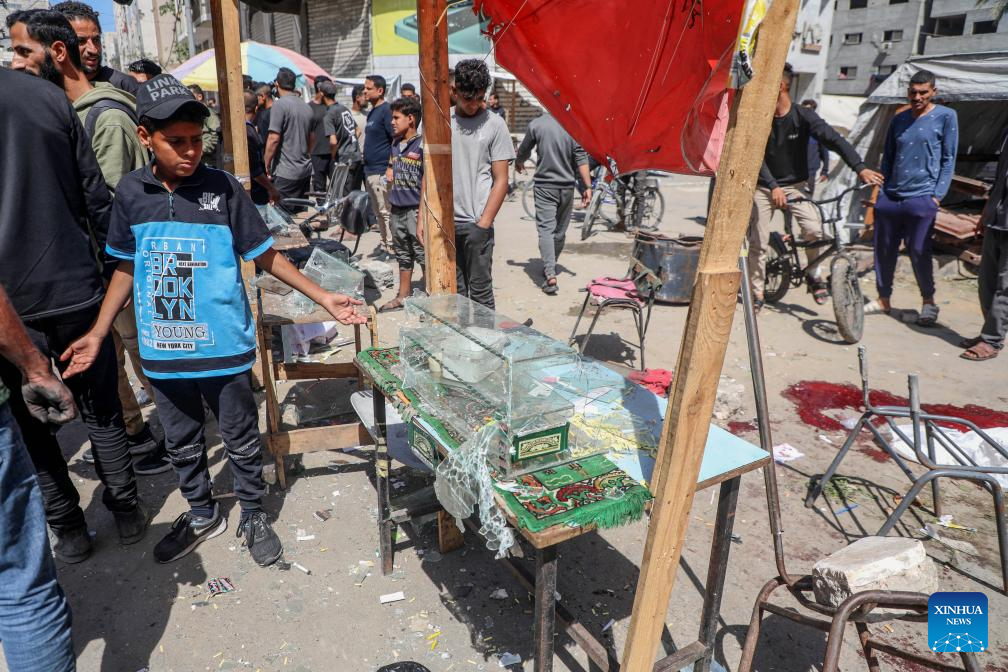Palestinians are seen at a market targeted in an Israeli airstrike in Gaza City, on May 7, 2025. At least 40 Palestinians were killed and dozens of others wounded in Israeli attacks in Gaza City on Wednesday, according to Palestinian medical sources. (Photo by Rizek Abdeljawad/Xinhua)